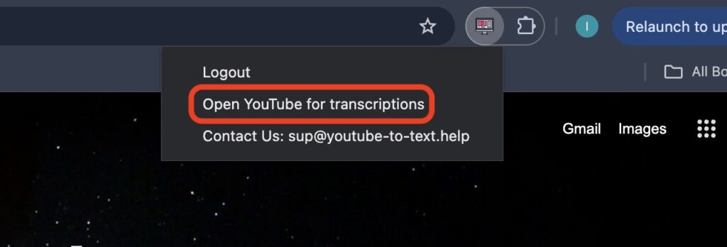 Click the YouTube to Text icon in your browser toolbar or find the extension button on the YouTube video page.